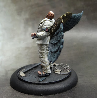 While the pose brings the opportunities to play with light and shadow on the wings and the suit, it does make it difficult to paint the face (particularly with the wings on) and get a clean photo of him. Apparently some angels age, and as they age, they lose their hair. Such has happened to Pete, but he's responded to this by growing a great big bushy beard.